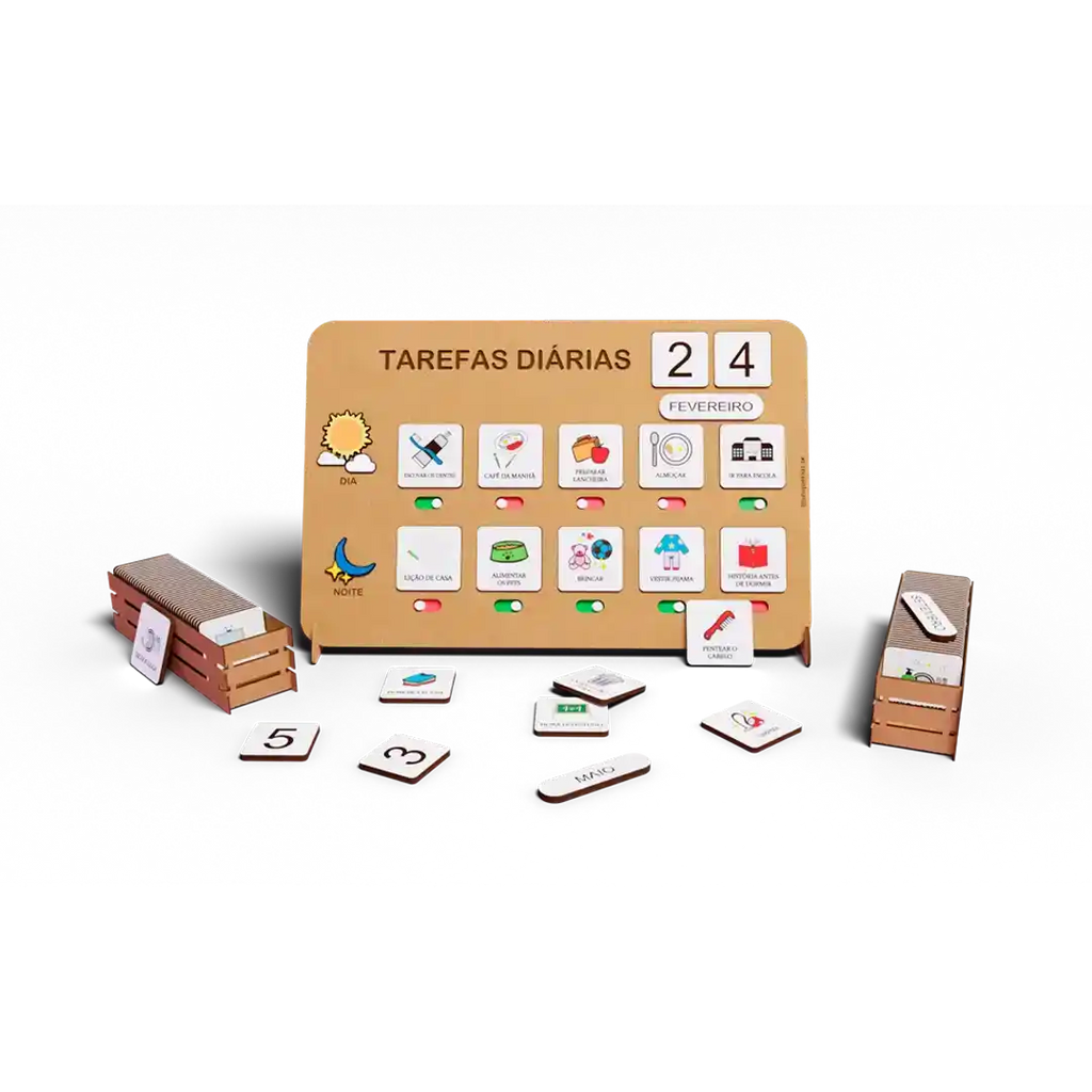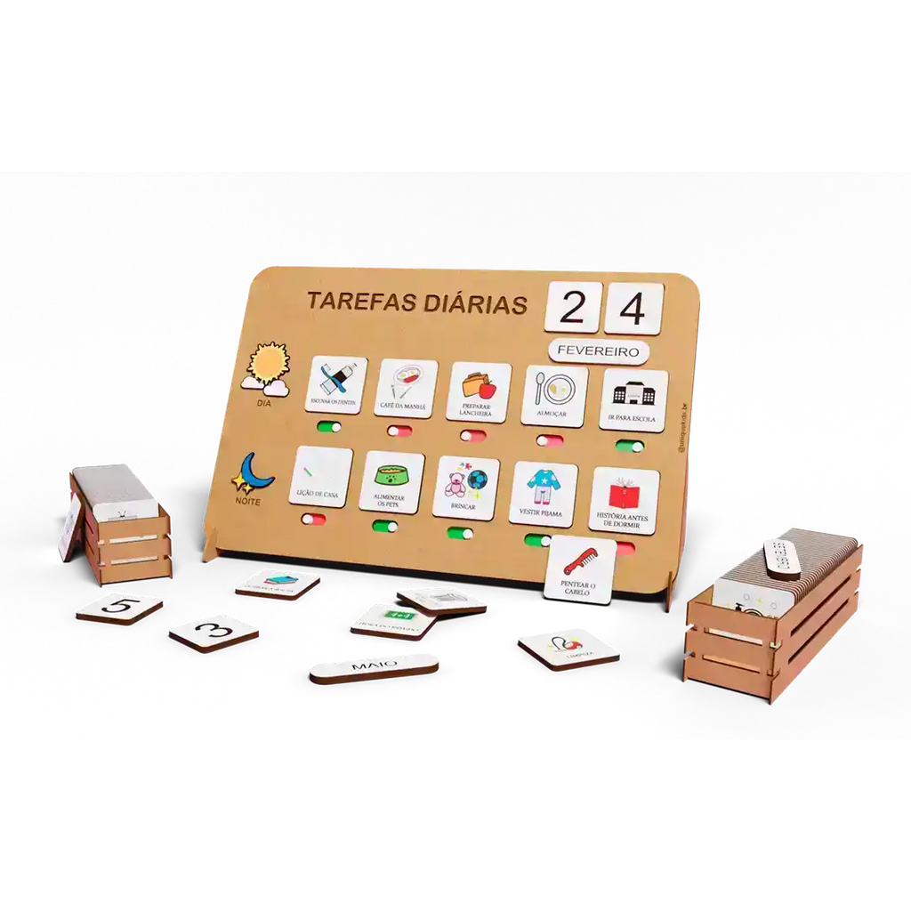Cada tarefa concluída vira um momento de conquista. Isso fortalece disciplina, autoestima e responsabilidade. Modo de uso: fixe o quadro, apresente as tarefas e deixe a criança interagir.